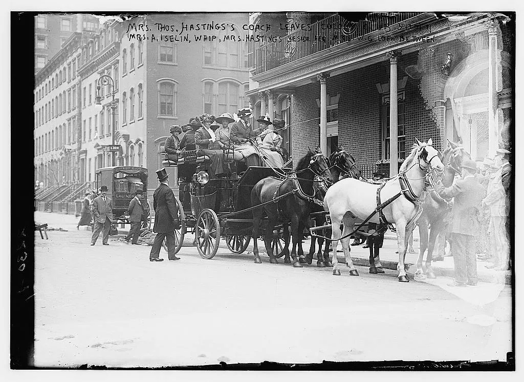 One of the Colony Club’s founders was Helen Benedict, a natural wit who was president of the Ladies Four-in-Hand Driving Club, which encouraged women to take the driver’s seat and steer four horses through the streets as men did. Here she is seen in front of the Colony Club as Eleanor Jay Iselin holds the whip. (Photo from Library of Congress, caption from Joanna Neuman)