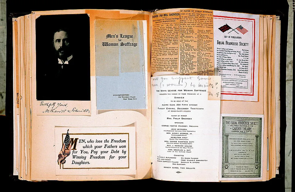 Two pages from the Scrapbooks of Elizabeth Smith Miller and Anne Fitzhugh Miller, with brochures, clippings and other ephemera related to the Men’s League for Woman Suffrage and the Equal Franchise Society. Note that the dinner invitation lists Oswald Garrison Villard (Fanny’s son) and Max Eastman on the committee. (Library of Congress)